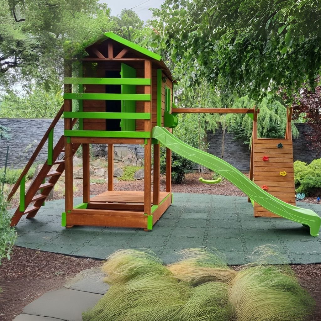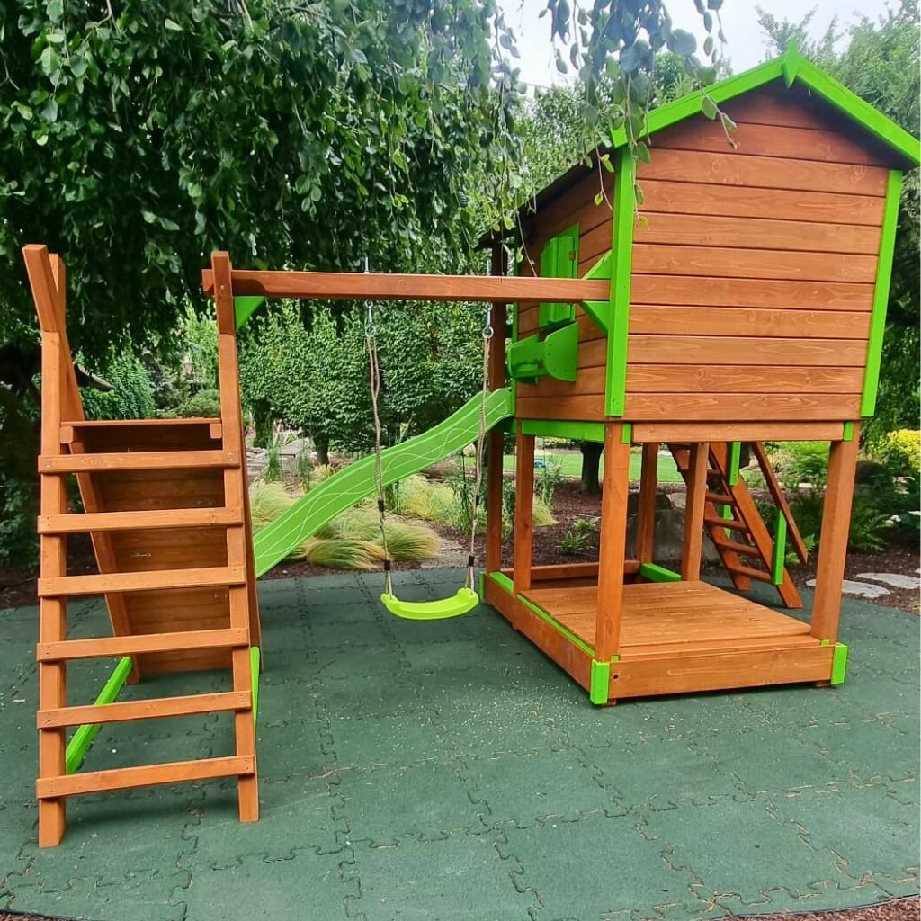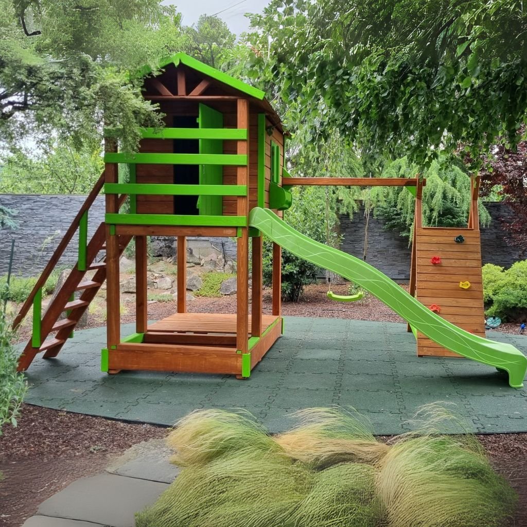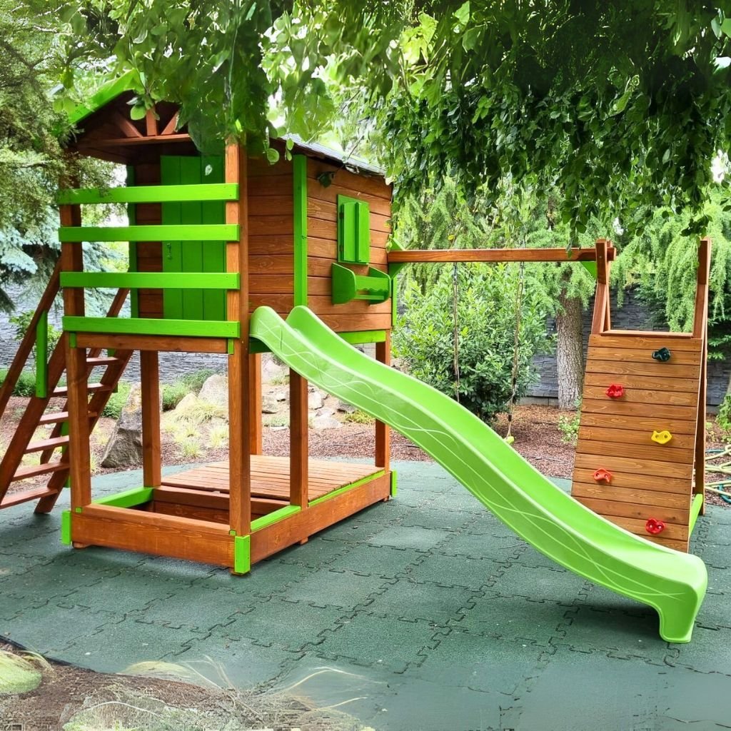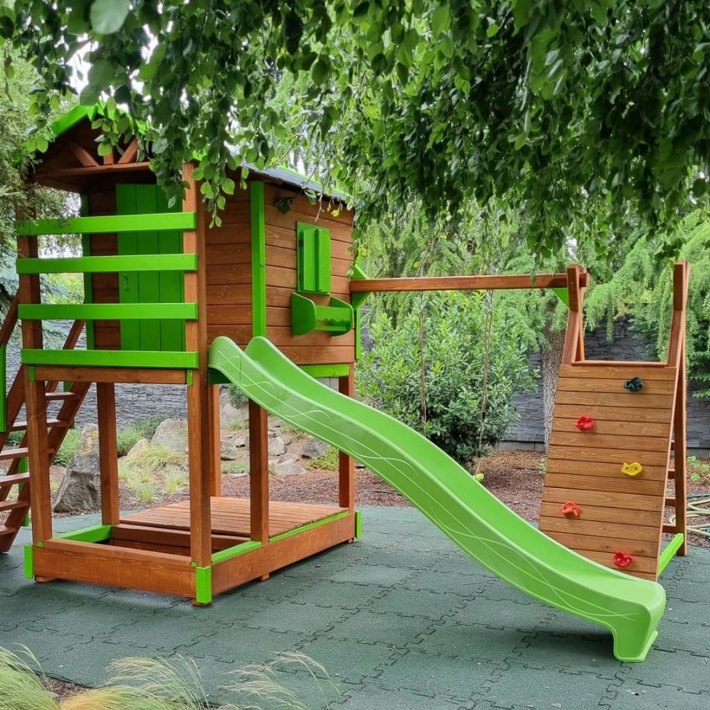 Drevený záhradný domček pre deti Milan s dlhou šmykľavkou, pieskoviskom a predĺžením na detské hojdačky pokryje všetko, čo vaše dieťa potrebuje pre plnú zábavu a bezpečnú hru.