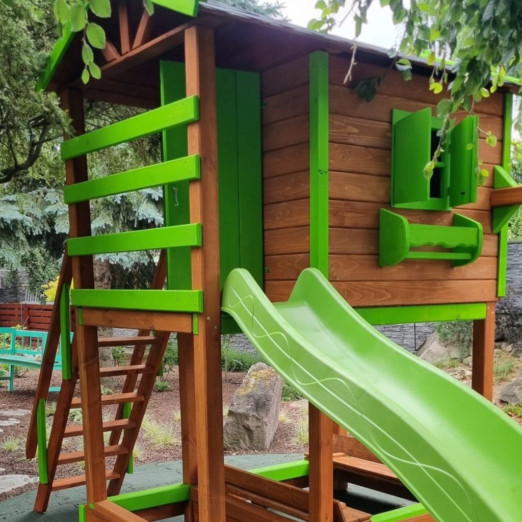 Rovnako ako ostatné modely dostupné v našom sortimente, aj drevený záhradný domček pre deti Milan s dlhou šmykľavkou