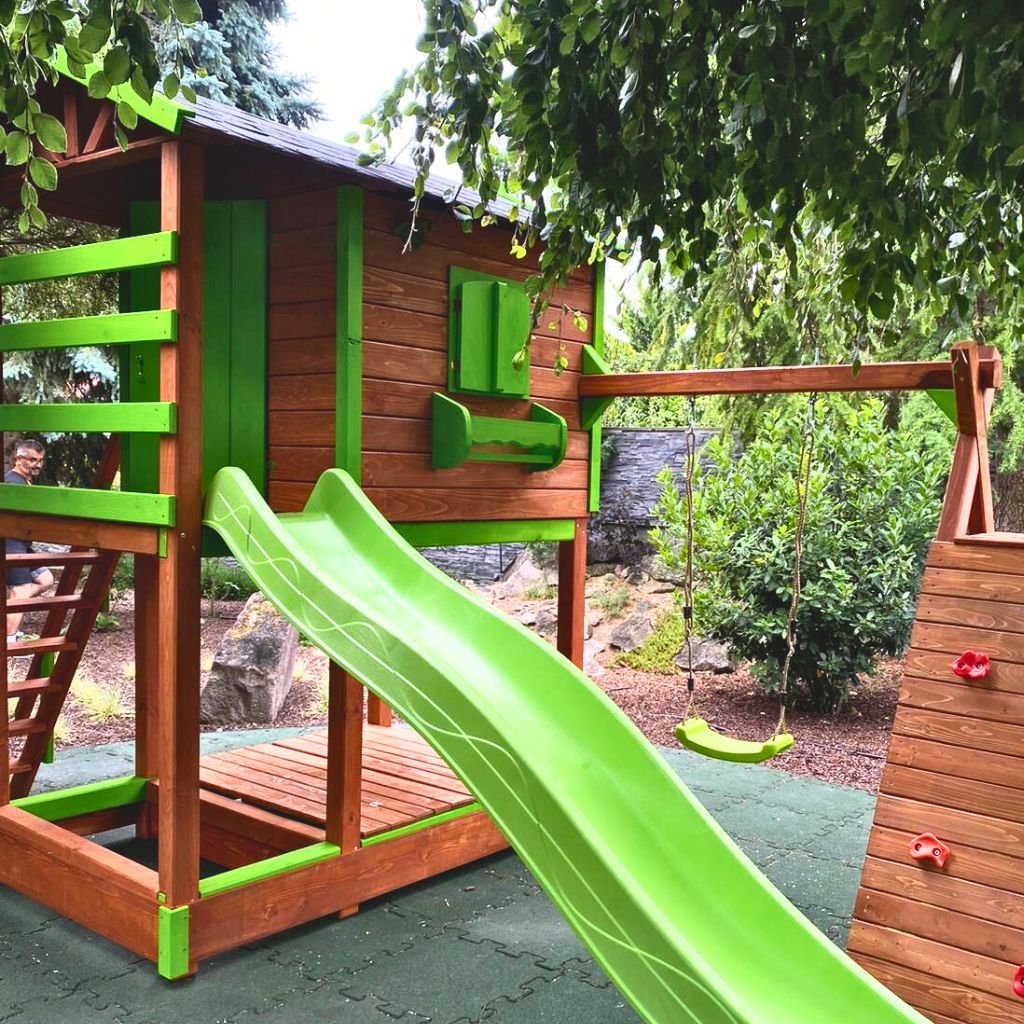 jedinečné ihrisko. V záhradnom domčeku s 2 hojdačkami, pieskoviskom a šmykľavkou zažijete
