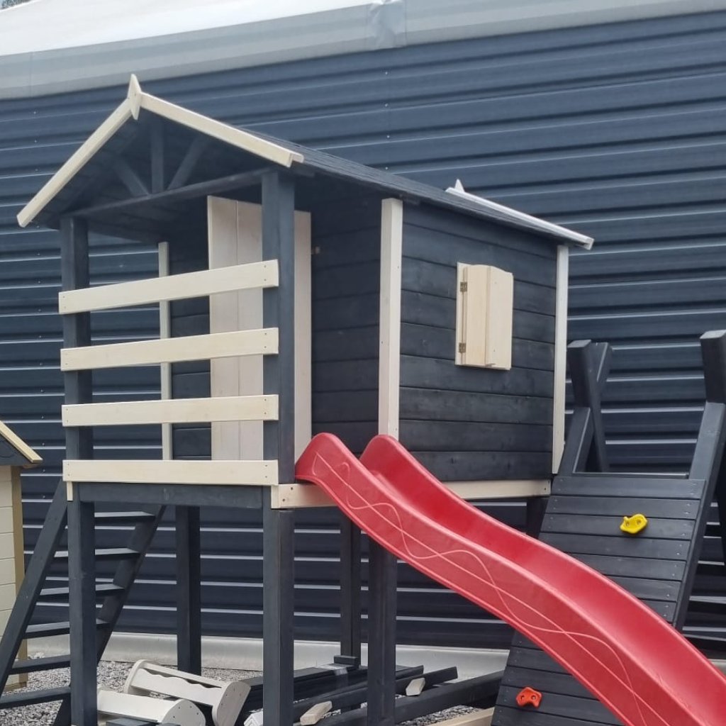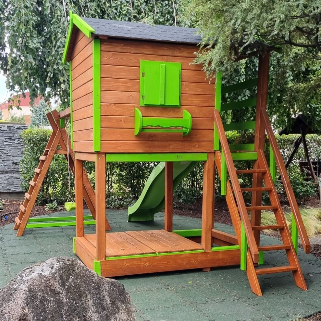 Jedným z našich návrhov je drevený záhradný domček pre deti Milan s dlhou šmykľavkou - model je určený pre deti od 3 rokov,